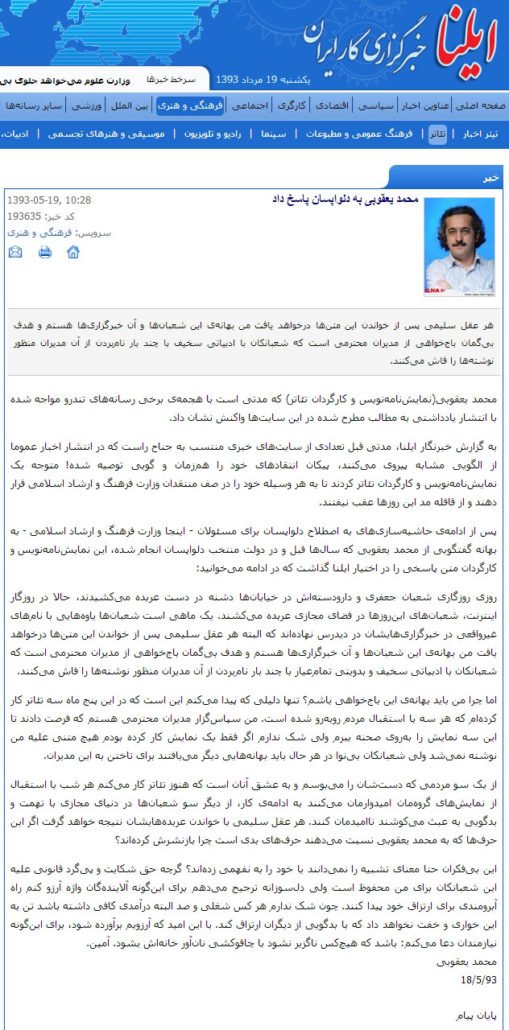 بسیار سپاسگزارم از حمایت مردم، هنرمندان، روزنامهنگاران، و البته معاونت محترم هنری، مدیر محترم ادارهی کل هنرهای نمایشی و همچنین مدیر محترم تماشاخانهی ایرانشهر که با مقاومت در برابر این نشر اکاذیب جانب حق را گرفتهاند و امیدوارم آقای ضرغامی هم در ماههای آخر حضور خود با اینگونه گزارشهای مردمآزار اقلیتی خودسر برخورد قاطع کند، امیدوارم اینگونه پروندهسازیهای غیرقانونی و غیرشرعی از رسانهها بهویژه رسانهی ملی رخت بربندد.