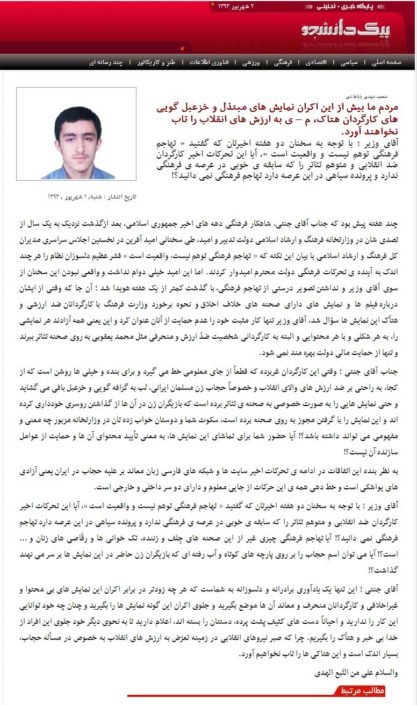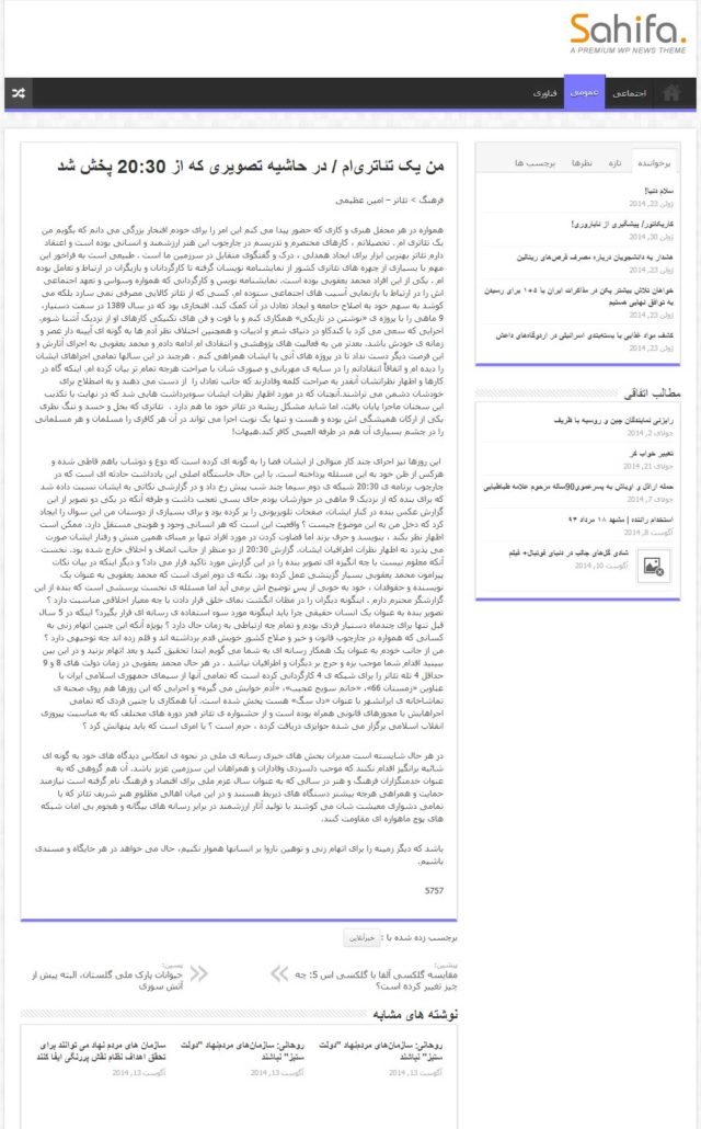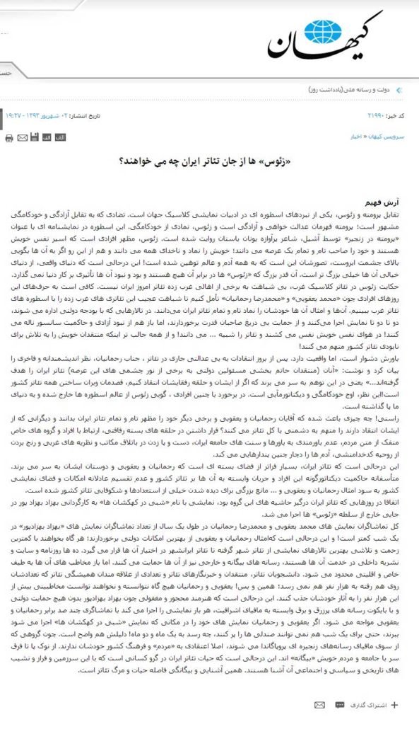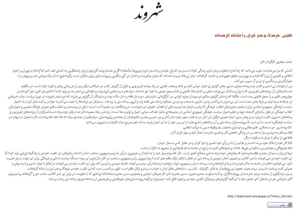 پس از اتهامات بیاساس و کذب چند رسانهی مجازی تندرو، پخش گزارش پُر افترا، سراسر کذب و فاقد وجاهت قانونی در یک برنامهی تلویزیونی و تکرار آن گزارش کذب در شبکهای دیگر بیش از هر زمانی وقتم را غارت کرده است. در شگفتم دستاندرکاران آن برنامههای تلویزیون که با پول بیتالمال میچرخد متکی بر کدام مفاد قانونی و کدام مجوز شرعی به خود حق دادهاند حرفها و نسبتهایی ناروا بزنند و اتهاماتی بیاساس به من وارد کنند؟ تاکنون هر کاری اجرا کردهام در چارچوب قانون و با مجوز قانونی بوده است. شگفتا که بر اساس گزارش مذکور دو مورد از موارد اتهامی من کارگردانی نمایشهای «زمستان ۶۶» و «دل سگ» بوده و سازندگان آن گزارش بیخبرند که دو نمایش نامبرده در دوران ریاست جناب ضرغامی در شبکهی ۴ سیما تولید و بارها پخش شده است. این بیخبران با پراکندن چنین اخباری به صحت و درستی عملکرد رسانهی ملی لطمه زده و آبروی رسانهی ملی را بردهاند. مسئولان این برنامهها را دعوت میکنم به خواندن و البته عمل کردن به «اصول سياست فرهنگي جمهوري اسلامي ايران» مصوب شوراي عالي انقلاب فرهنگي که رئیس سازمان صدا و سیما یکی از اعضای حقوقی این شوراست. در پیشگفتار این مصوبه آمده است: «يكي از برجستهترين فعاليتهاي شوراي فرهنگ عمومي و شوراي عالي انقلاب فرهنگي در طول سالهاي گذشته، تهيه و تنظيم اصول سياست فرهنگي جمهوري اسلامي در مجموعهاي شامل اهداف، مباني، اصول و اولويتها است». بر اساس مفاد مصوبهی ذکرشده رفتار خودسرانهی دستاندرکاران آن برنامههای تلویزیون و رسانههای تندروی اقلیت در بارهی من و پخش بدون اجازهی تصویر دیگران در کنار من به قصد متهمجلوهدادن آنان و من، تعبیر و تفسیر دلخواهشان از سخنانم و وارونهسازی حرفهایم از مصادیق مواد ۱۷، ۱۸، ۲۰، ۲۲ و ۲۴ بند دال با عنوان «منبهات در سياست فرهنگي» است. به این امید که پروندهسازان رسانهی ملی و آن رسانههای تندرو شاید از این پس خود را به این اصول پایبند بدانند نص صریح مواد ذکرشده را ضروری میدانم: