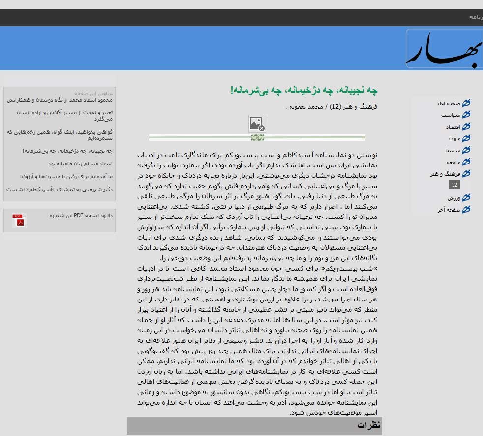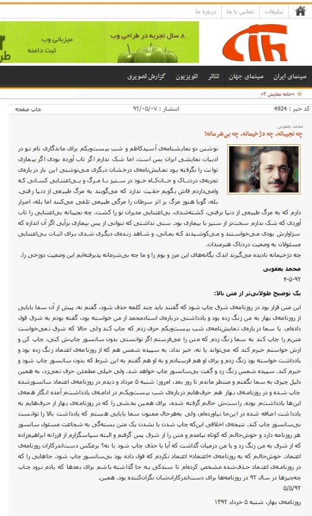 این متن قرار بود در روزنامهی شرق چاپ شود که گفتند باید چند کلمه حذف شود، گفتم نه. پیش از آن سما بابایی از روزنامهی بهار به من زنگ زده بود و یادداشتی دربارهی استادمحمد از من خواسته بود، گفته بودم به شرق قول دادهام، با سما دربارهی نمایشنامهی شب بیستویکم حرف زدم که چاپ کند ولی حالا که شرق نمیخواست متنم را چاپ کند به سما زنگ زدم که متن را میفرستم اگر توانستی بدون سانسور چاپش کنی، چاپ کن و ازش خواستم خبرم کند که میتواند یا نه، خبر نداد. به سپیده شمس هم که از روزنامهی اعتماد زنگ زده بود و یادداشت خواسته بود زنگ زدم و برای او هم فرستادم و به او هم گفتم به این شرط که بدون سانسور چاپ شود و خبرم کند. سپیده شمس زنگ زد و گفت بیسانسور چاپ خواهد شد. ولی خیلی مطمئن حرف نمیزد، به همین دلیل چیزی به سما نگفتم و منتظر ماندم تا روز بعد، امروز: شنبه پنج مرداد و دیدم در روزنامهی اعتماد سانسورشده چاپ شده و در روزنامهی بهار هم حرفهایم دربارهی شب بیستویکم در ادامهی یادداشتم آمده انگار همهی اینها یادداشتم بوده. راستش حالم گرفته شده، برای همین بخشی را که در روزنامهی بهار از حرفهایم به یادداشت اضافه شده در اینجا نیاوردهام، ولی بههرحال ممنون سما بابایی هستم که یادداشت بالا را توانست بیسانسور چاپ کند. نتیجهی اخلاقی اینکه چاپشدن یا نشدن یک متن بستهگی به شجاعت مسئول سانسور هر روزنامه دارد و خوشحالم که کوتاه نیامدم و متن را از شرق پس گرفتم و البته سپاسگزارم از فرزانه ابراهیمزاده که از شرق به من زنگ زد و با من درمیان گذاشت که آیا با حذف چاپ شود یا نه؟ برعکس دستاندرکاران روزنامهی اعتماد. خوشحالم که به روزنامهی «اعتماد» اعتماد نکردم که قول داده بود بیسانسور چاپ شود. جاهایی را که در روزنامهی اعتماد حذفشده مشخص کردهام تا سندکی به جا گذاشته باشم برای بعدها که یادم نرود چاپ چهچیزها در سال ۹۲ در روزنامهها برای دستاندرکارانشان نگرانکننده بود. همین.